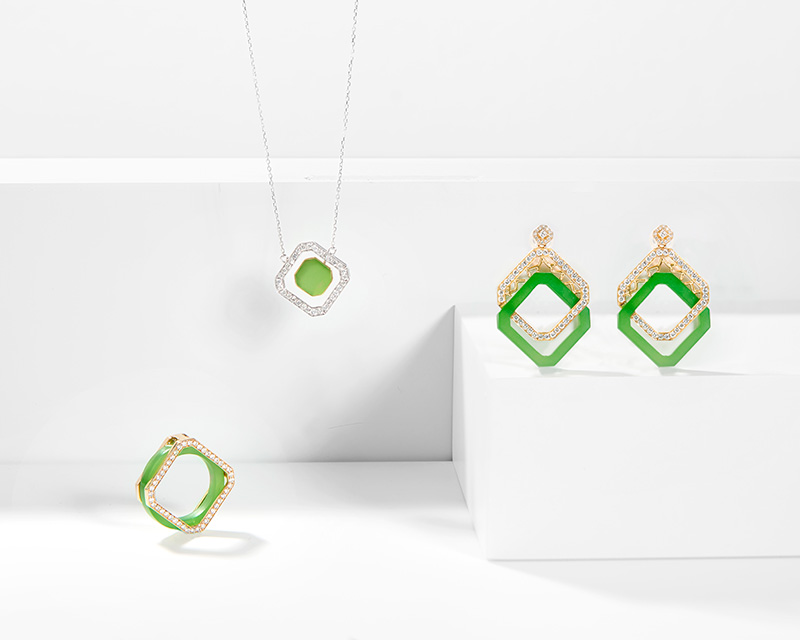 “锦瑟年华套装”灵感来源于苏州园林里极具特色的洞窗,用精湛技艺演绎洞窗的“洞”这一特点,打破了空间的限制,为佩戴者带来不一样的层次美感。