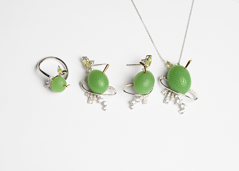 “柠檬半夏套装”灵感源自夏日里清凉的柠檬水,设计师结合和田玉的特性,细致雕琢柠檬表皮,柠檬生动诱人,再用K金和钻石表现迸溅出来的水花,彰显夏日年轻与活力。