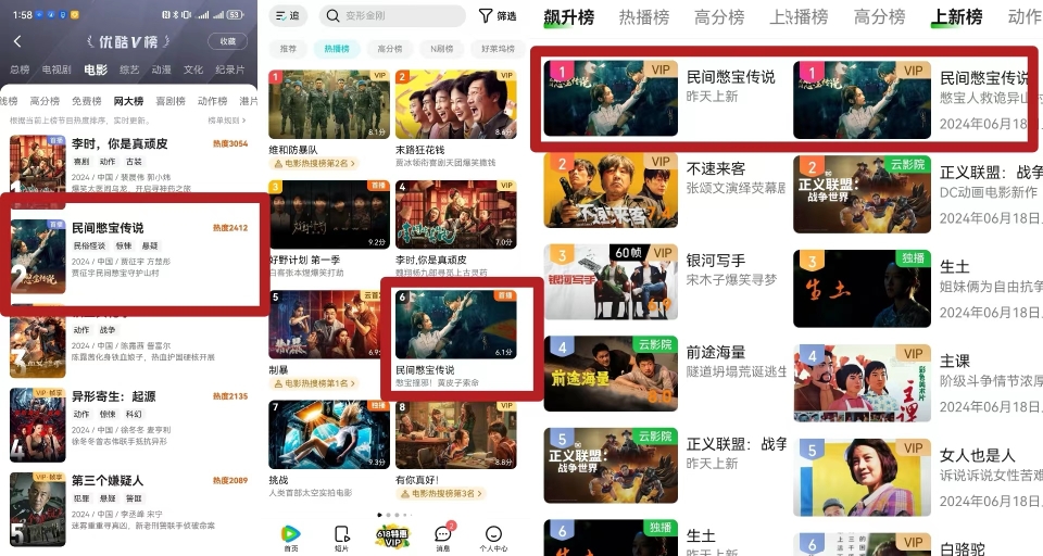 爱奇艺电影上新榜、飙升榜双榜首;优酷电影网大榜第二;腾讯电影热播榜第六……